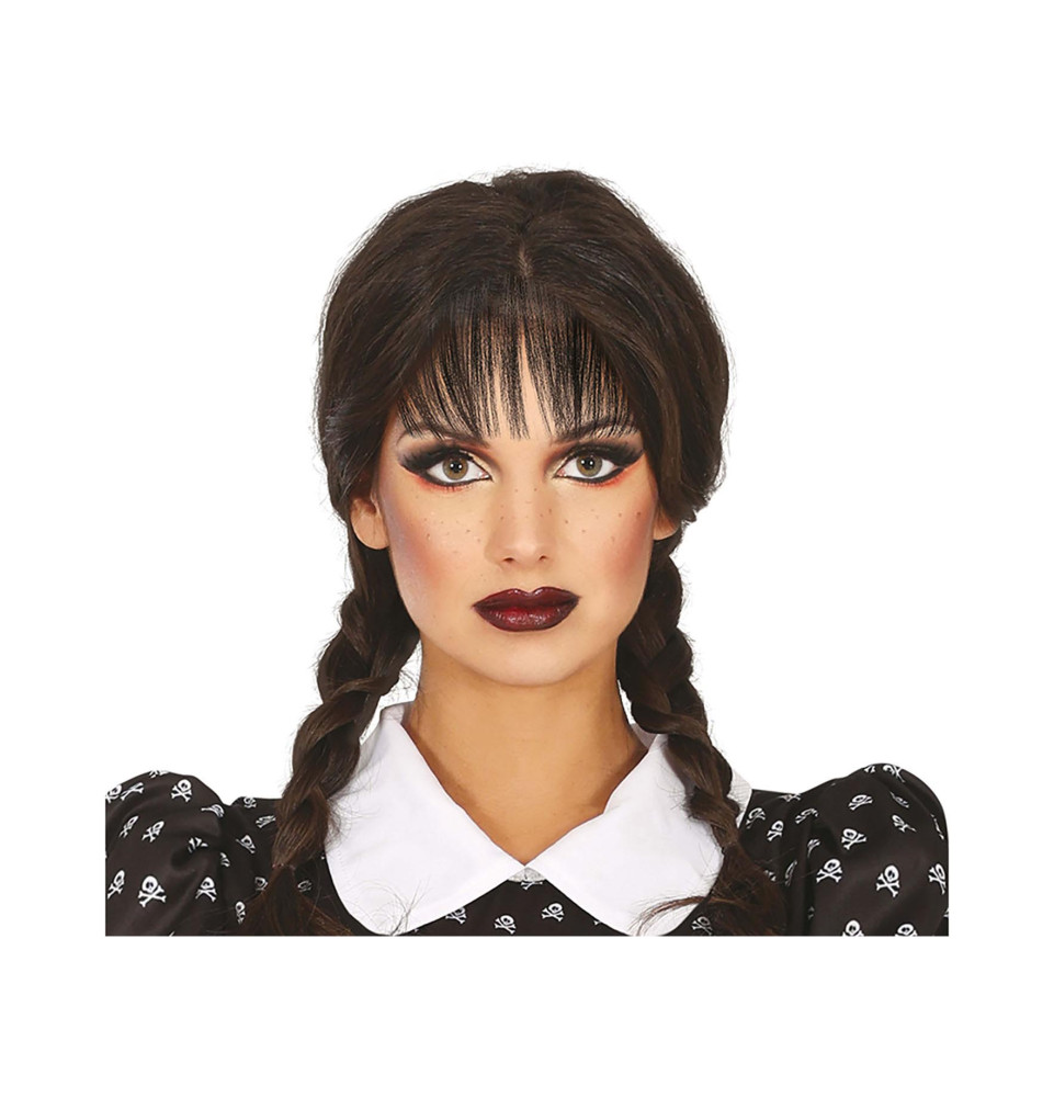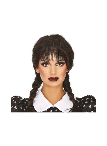 Perruque femme de Mercredi Addams avec tresses noires et frange !